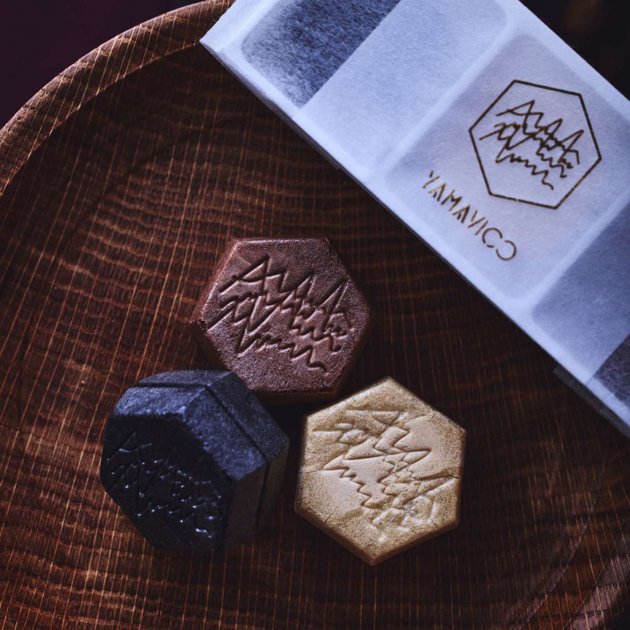 洋風最中YAMAVICO TRIOは、縁起が良いとされる「亀甲文様」の六角形。お味は「いちじく」、「ショコラ」、「粒あんこ」の3種類を1袋に詰め合わせています。本商品は、3袋をギフトボックスに詰め合わせています。
