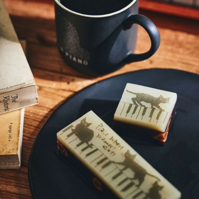 ジャズ羊羹の人気No.1商品「classic」のお味をベースに、表面の絵柄を「実在する保護猫たちとピアノのイラストに置き換えた特別限定商品です。